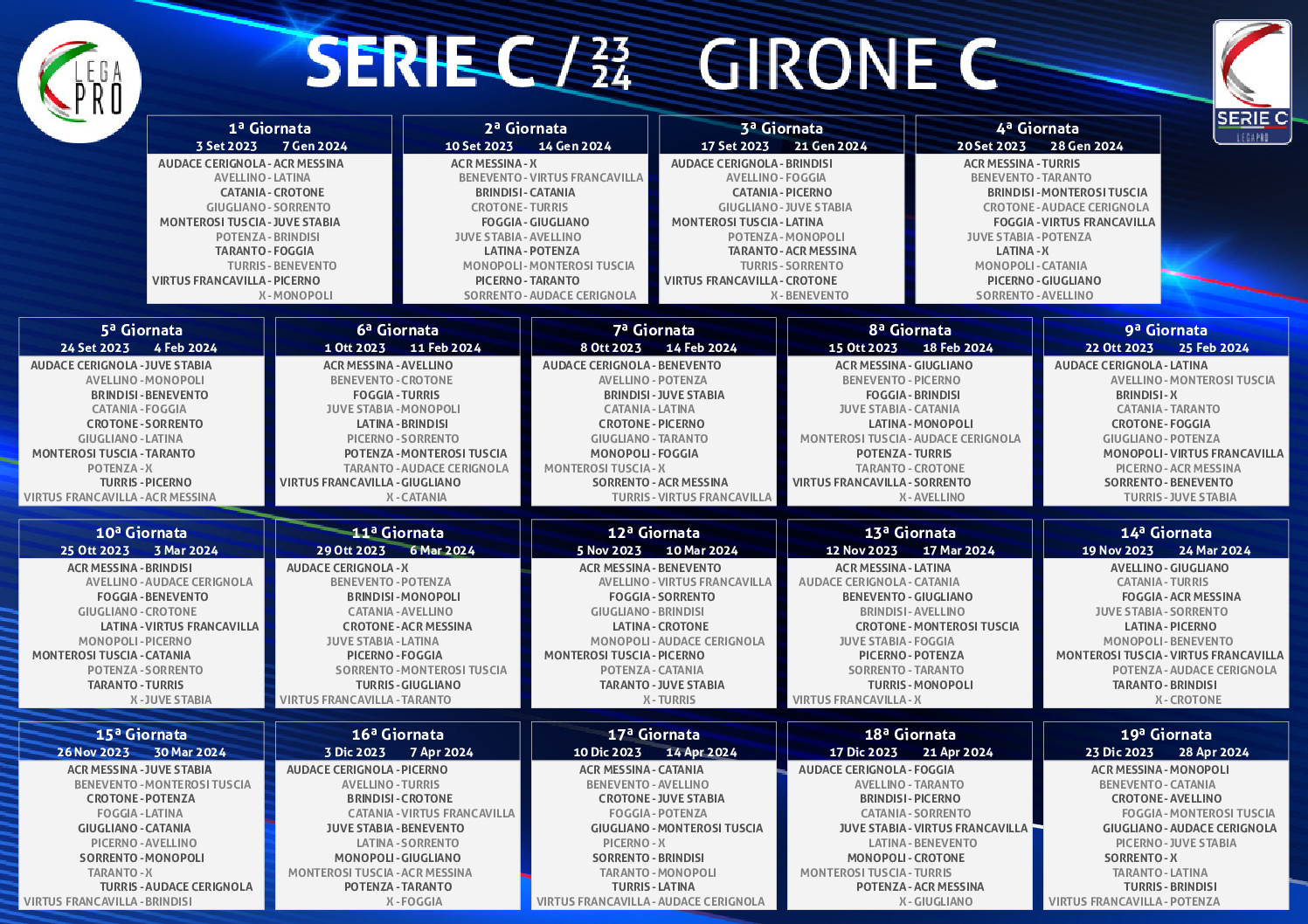 C…siamo: parte da Giugliano l’avventura del Sorrento nel campionato di Lega Pro 2023/2024. Appuntamento il 3 settembre al De Cristoforo poi sarà presto tempo di altri derby con Turris e Avellino mentre chiuderemo il campionato in casa della formazione contrassegnata da una X nel calendario che è stato appena emanato in quel di Firenze. Tante le sfide in programma con formazioni di grande tradizione come Benevento, Foggia, Taranto e Catania. Scorrete con noi, giornata per giornata, questa magnifica avventura che C…aspetta!