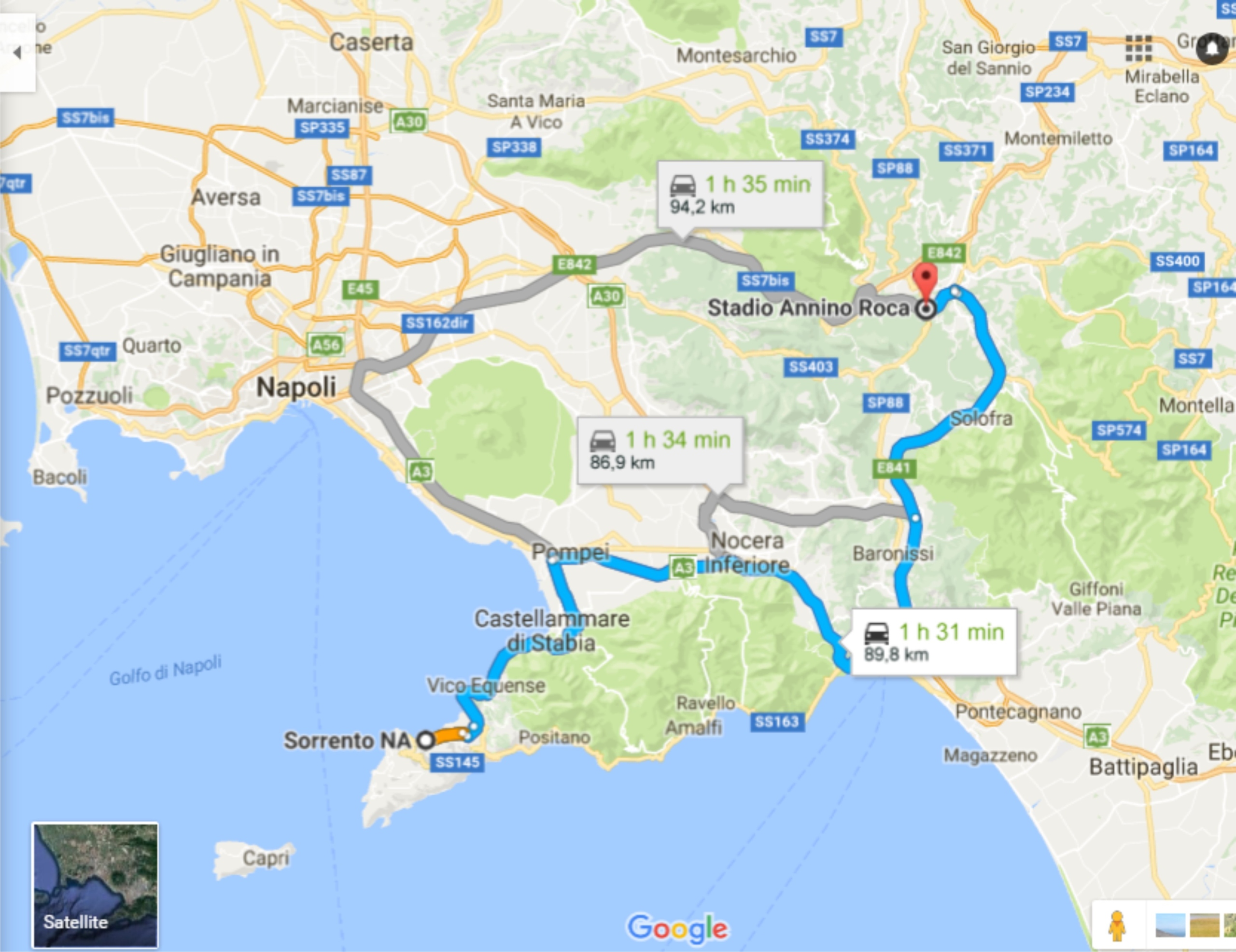 Ecco la mappa per raggiungere lo Stadio Annino Roca di Avellino, situato in Via Due Principati, 63. Tempo di percorrenza: 1 ora e 30 minuti circa, salvo traffico e imprevisti.