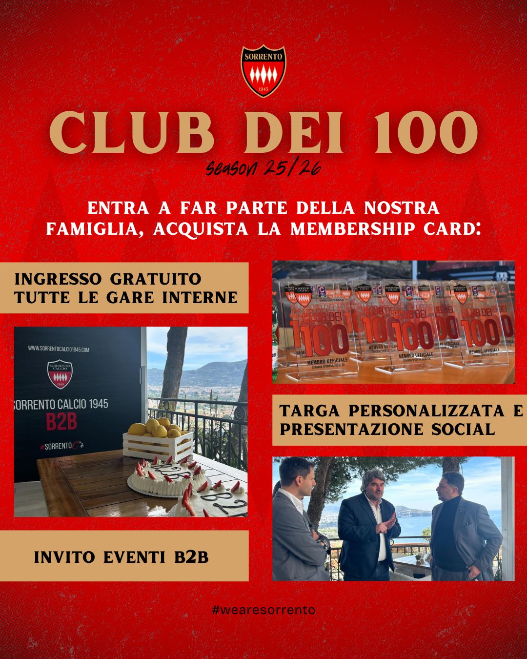 Con la nostra membership card potrai richiedere un titolo di accesso gratuito a tutte le gare casalinghe del Sorrento ti ed avrai diritto alla targa “Club del 100” (con foto sui social ufficiali alla consegna). Inoltre, parteciperai ai nostri eventi B2B e riceverai tutte le informazioni sulle iniziative della società, le attività della prima squadra e del settore giovanile.