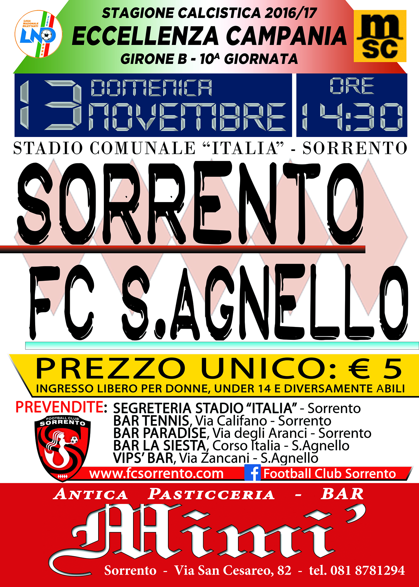 Il Football Club Sorrento rende noto le modalità di vendita dei tagliandi di ingresso per assistere alla gara Sorrento-Sant’Agnello, che si disputerà domenica 13 novembre alle ore 14,30 presso lo Stadio Italia di Sorrento e valevole per la 10° giornata del Campionato Regionale di Eccellenza – Girone B.